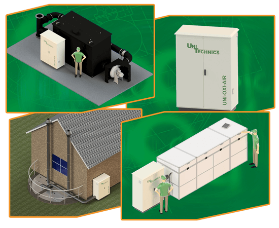 Die Abluftbehandlungsanlage UNI-Air ist ein modulares System zur Behandlung von Emissionsstoffen aus dem Abwasser. Mit der Oxidationsstufe werden eine Vielzahl von Schadstoffen wie H2S, Mercaptane, VOC sowie viele weitere aufgrund des starken Oxidationspotentials von Ozon aus dem Abgas eliminiert.